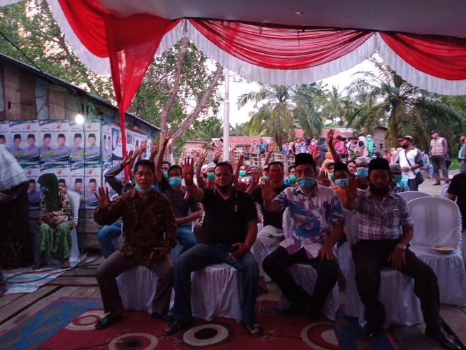 ROKAN HILIR | TRANSPUBLIK.co.idAntusias dan semangat masyarakat Kep. Teluk Merbau dalam kampanye dialogis AMAN Afrizal-Sulaiman di sore hari tepat di kediaman Rusmadi Dusun Sungai Juan Rt 003 Rw 003, Kel. Teluk Merbau, Kec. Kubu, Rabu (4/11/2020) pukul 16.00 WIB.