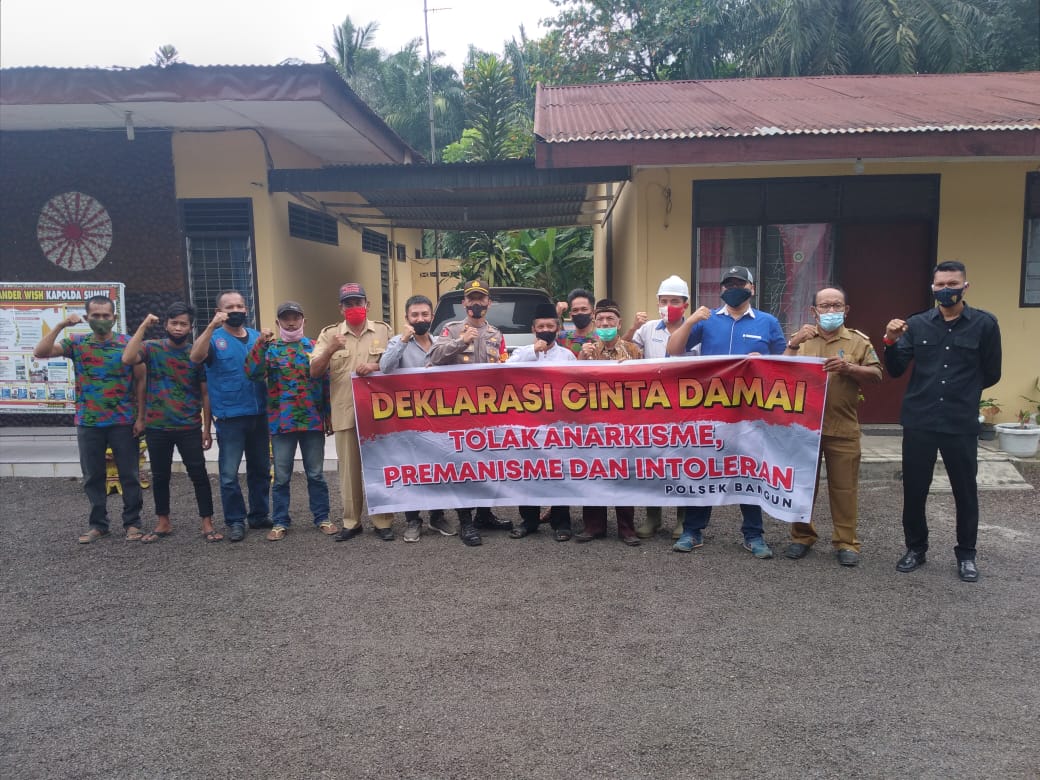 SIMALUNGUN | TRANSPUBLIK.co.id Kapolres Simalungun AKBP Agus Waluyo S.I.K., bersama sejumlah elemen masyarakat Kelurahan Bangun mendeklerasikan cinta damai sebagai bentuk penolakan terhadap radikalisme dan intolernasi beragama di depan Polsek Bangun, Kecamatan Gunung Malela, Kabupaten Simalungun, Selasa (3/11/2020 ) sekira pukul 13:30 WIB.