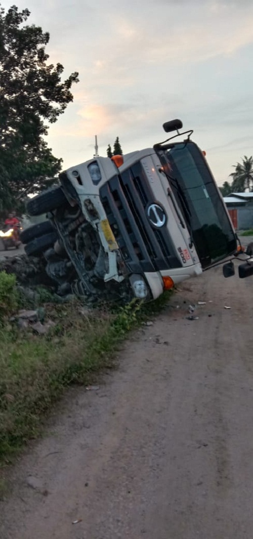 SERGAI | TRANSPUBLIK.co.id – Diduga akibat mengantuk, Fuso HINO Nomor Polisi BK 8221 EL yang dikemudikan oleh Galang Sihombing (60) warga Keluharan Tanjung Mulia Hiling, Kec. Medan Deli, Kota Medan, Oleng menabrak pembatas jalan lalu fuso tersebut terbalik di Jalan Lintas Sumatera (Jalinsum) tepatnya di Dusun II, Desa Sei Sijenggi, Kec. Perbaungan, Serdang Bedagai, Selasa (2/6/2020).