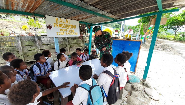 KEEROM | TRANSPUBLIK.co.id – Kegiatan mengajar yang terus dilakukan kepada anak perbatasan khusunya di Sektor Utara Papua, salah satu upaya untuk meningkatkan kualitas pelajar Papua, Satgas Pamtas Yonif Raider 100/PS Pos Waris menggelar Bimbingan Belajar (Bimbel) di Pos Waris, Kampung Banda.