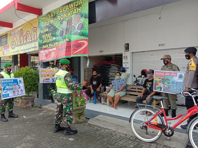 Seperti halnya yang dilakukan oleh anggota Koramil Tipe B 0808/01 Kota Kodim 0808 Blitar, bersama anggota Polsek Kepanjenkidul dan anggota Satpol PP pada hari Minggu (05/12/2020), melaksanakan himbauan protokol kesehatan 3 M guna memutus penyebaran Covid-19 di wilayah binaannya, dengan sasaran Pasar Wage Jl. Mastrip dan Alon-Alon Kota Blitar.