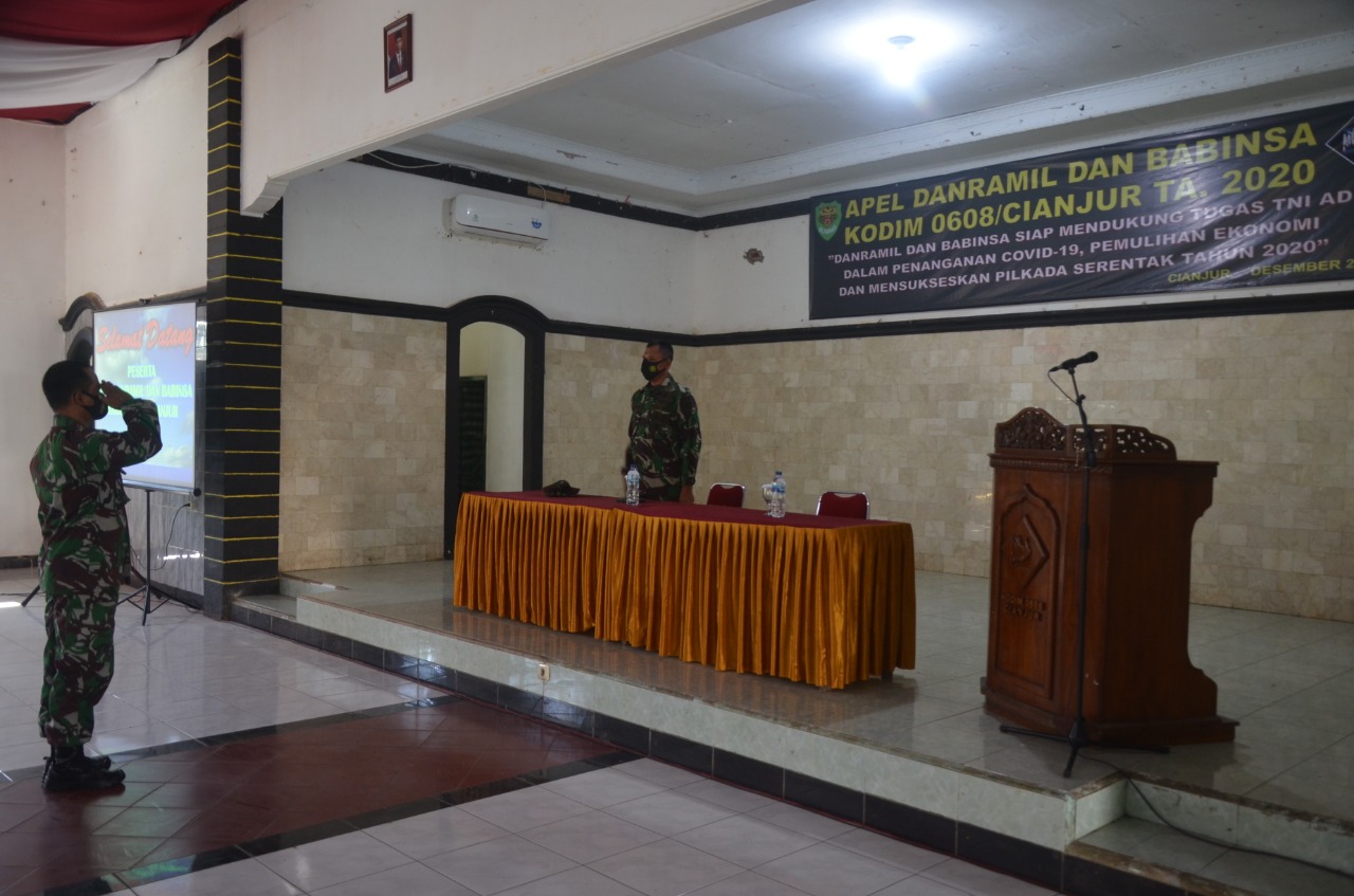 Apel yang dihadiri Kasdim 0608/Cianjur, Mayor Inf Suntoro dan para perwira seksi, Danramil dan Babinsa jajaran Kodim 0608/Cianjur mengusung tema “Danramil dan Babinsa Siap Mendukung Tugas TNI AD dalam Penanganan Covid-19, Pemulihan Ekonomi dan Mensukseskan Pilkada Serentak Tahun 2020.”