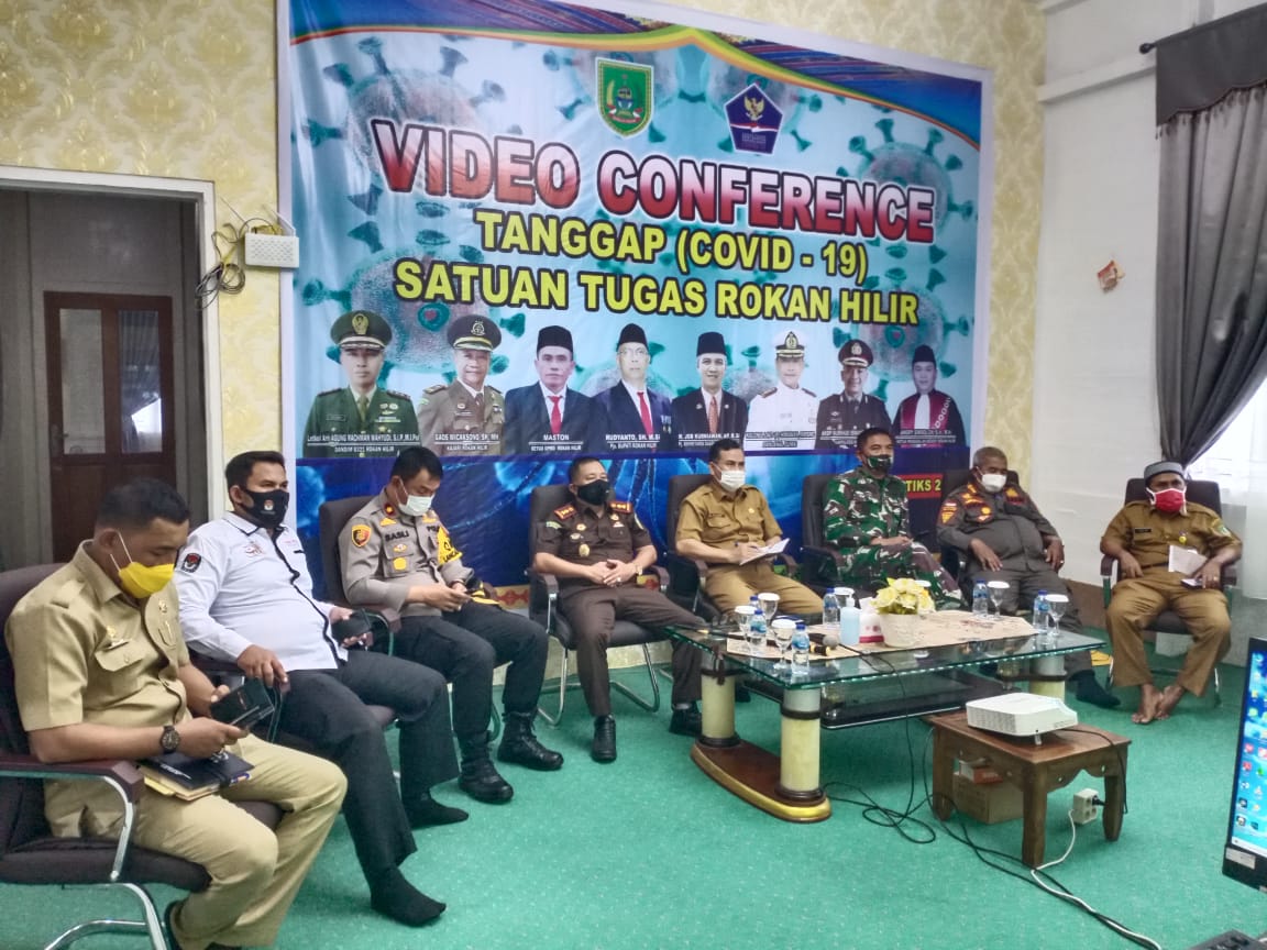 ROKAN HILIR | TRANSPUBLIK.co.id -Assisten III Kabupaten Rokan Hilir, Dandim-0321/Rohil, Kapolsek Bangko, Ketua KPU Rohil, Ketua Bawaslu Rohil mengikuti video conference bersama Menkopolhukam terkait dengan pelaksanaan pilkada serentak, Senin (23/11/2020) saat di ruang Kantor Bupati Rohil.