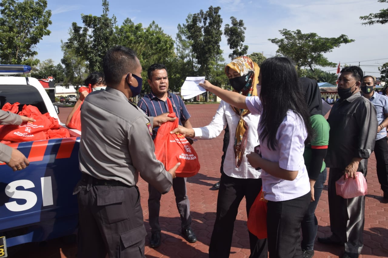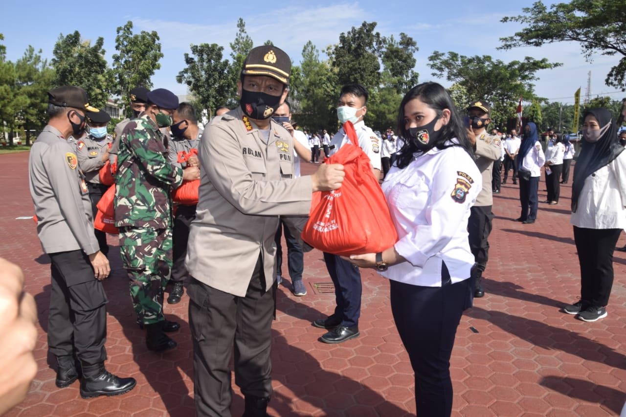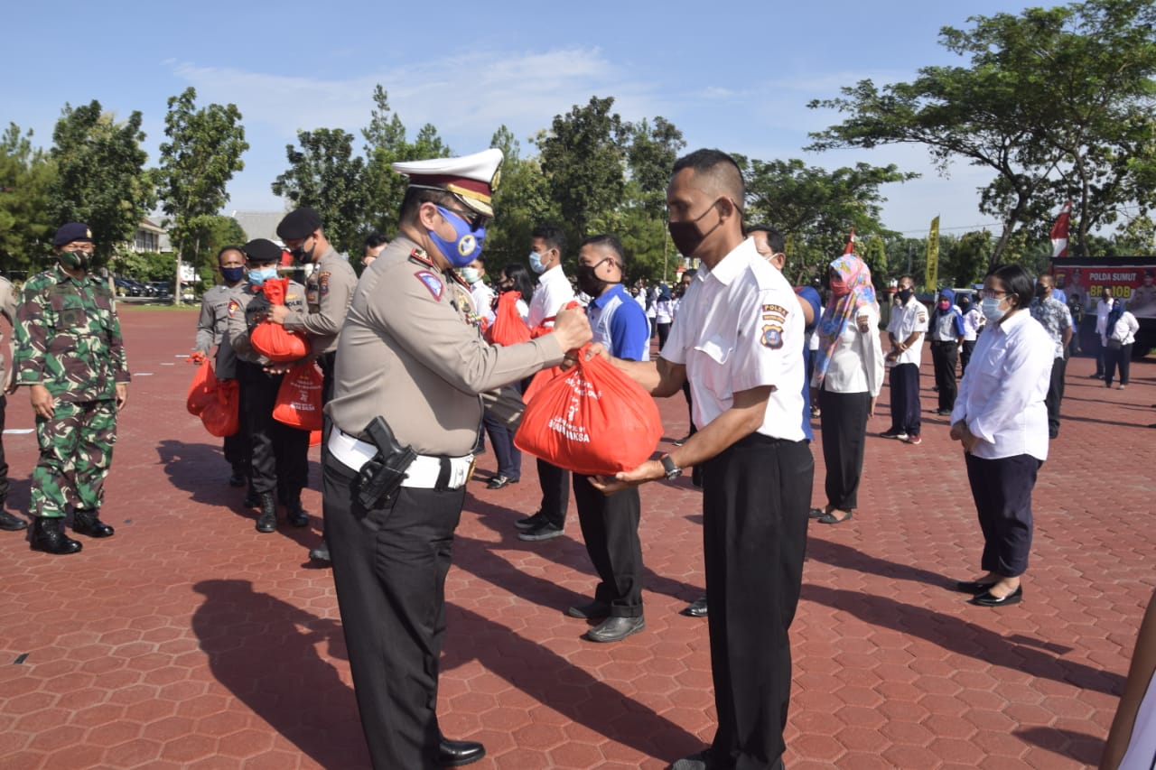 Dengan pembagian paket Sembako tersebut secara simbolis diberikan dari masing-masing perwakilan Satker (Satuan Kerja) penerima bantuan sosial (Bansos) di lingkungan Poldasu.