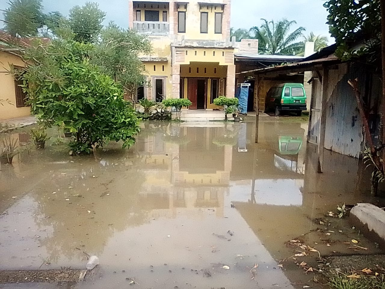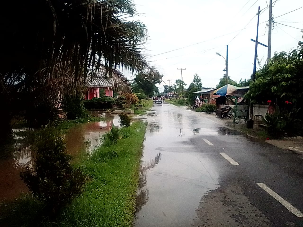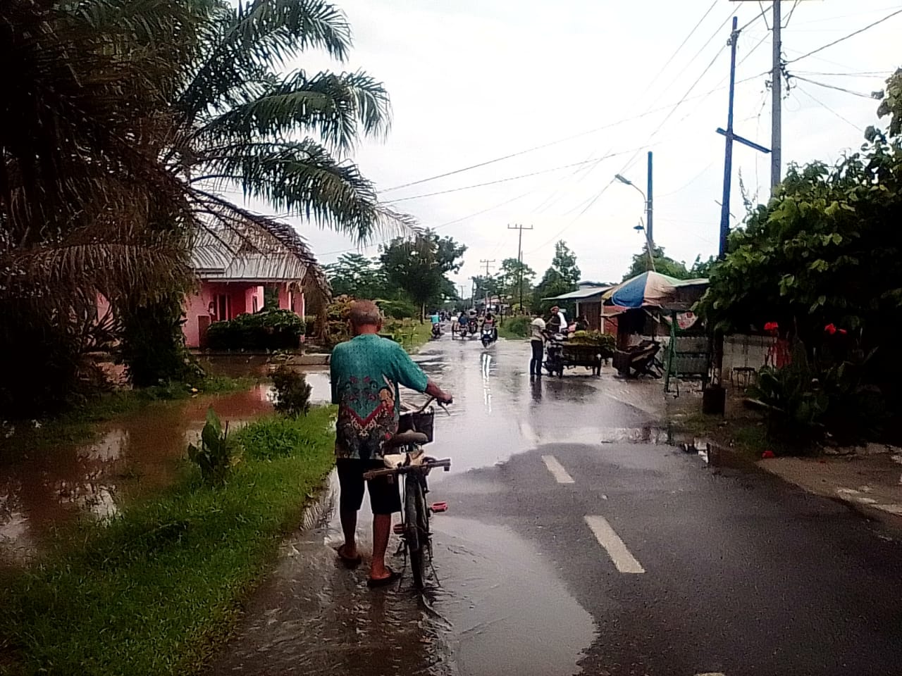 Tampak pada foto, beberapa rumah warga dan ruas jalan yang tergenang air dan mengakitbatkan akses jalan terganggu bagi pengguna kendaraan bermotor yang akan melintas pada jalan tersebut.