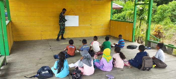 KEEROM | TRANSPUBLIK.co.id – Personel Pos Arso 13 Satgas Pamtas Republik Indonesia (RI) – Papua Nugini (PNG) Yonif 100/PS Pos Arso 13 memberikan Bimbingan Belajar (Bimbel) kepada anak-anak Sekolah Dasar (SD) di Kampung Naramben, Distrik Skanto, Kabupaten Keerom, Papua, Sabtu (17/10/2020).