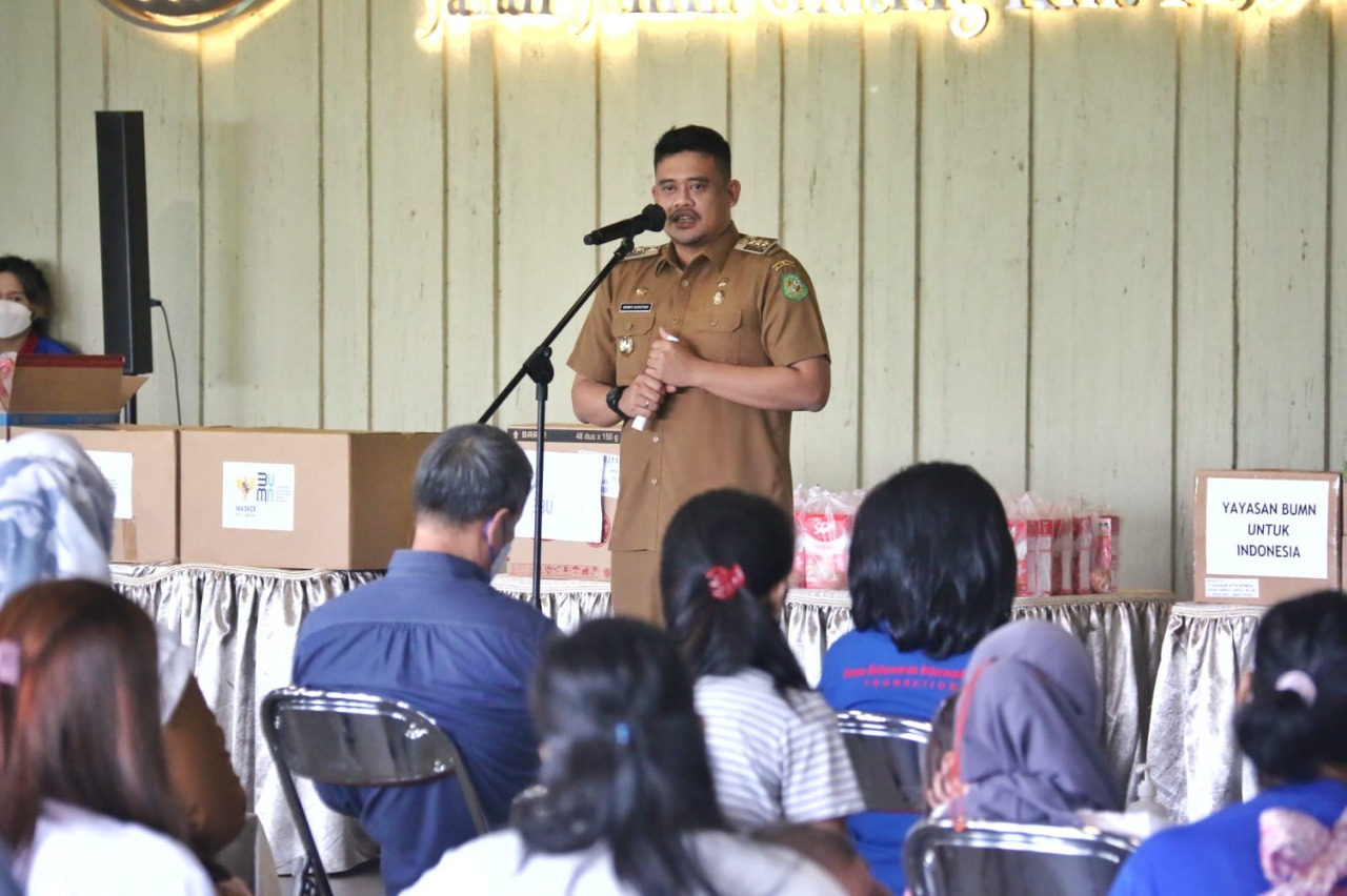 MEDAN | TRANSPUBLIK.coi.id –  Wali Kota Medan, Bobby Nasution mengapresiasi sekaligus mengucapkan terimakasih kepada Yayasan BUMN yang sudah memberikan bantuan makanan tambahan kepada anak-anak di Kota Medan. Hal ini diharapkan dapat menambah asupan gizi bagi anak sehingga dapat terhindar dari masalah stunting.