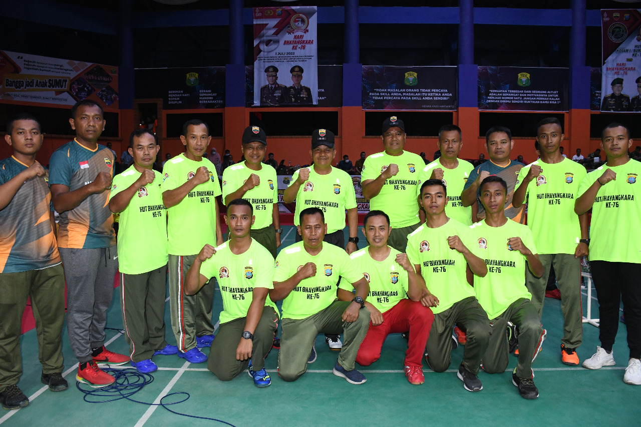 MEDAN | TRANSPUBLIK.co.id –Pembukaan Turnamen Badminton TNI-Polri menyambut HUT ke-76 Bhayangkara dan HUT ke 72 Kodam I/BB resmi dibuka dengan ditandai pemukulan Gong oleh Gubsu H. Edy Rahmayadi dan pemukulan shuttle cock oleh Forkopimda Sumut , Selasa (21/6/2022).