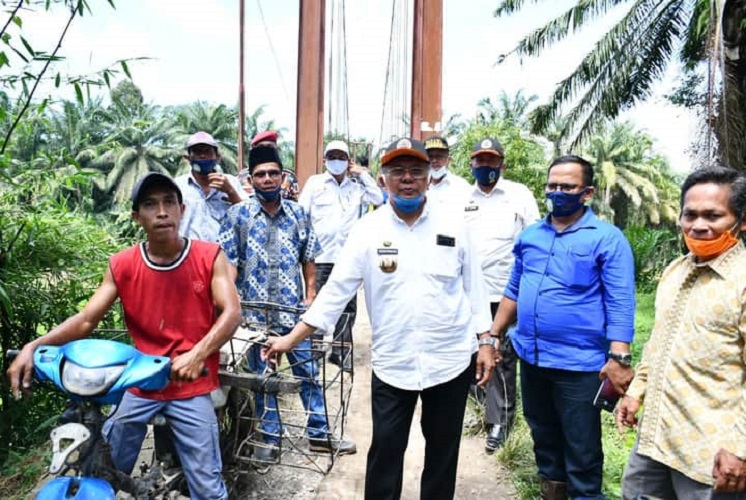 SERGAI | TRANSPUBLIK.co.id – Bupati Sergai H. Soekirman meninjau kondisi jembatan gantung yang menjadi sarana transportasi utama bagi warga petani di Dusun Sotul, Desa Juhar, Kecamatan Bandar Khalifah, Rabu (29/7/2020).