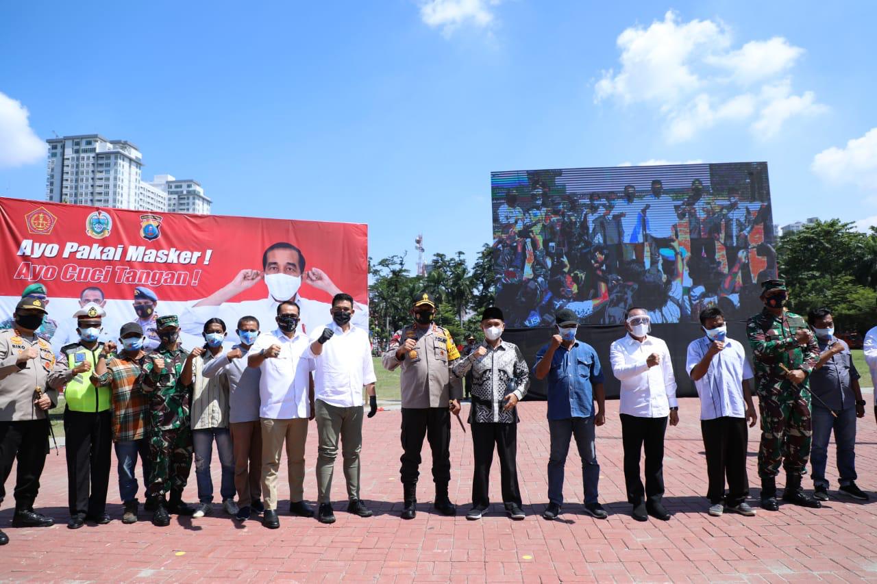 Transpublik.co.id Medan-Apel launching pembagian masker di laksanakan Polda Sumut dalam rangka menekan angka penyebaran covid -19 di wilayah Sumut yg di laksanakan pada hari Kamis (10/9) bertempat di Lapangan merdeka Medan.