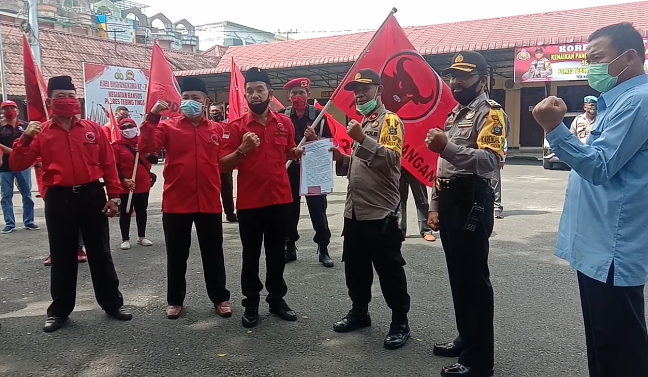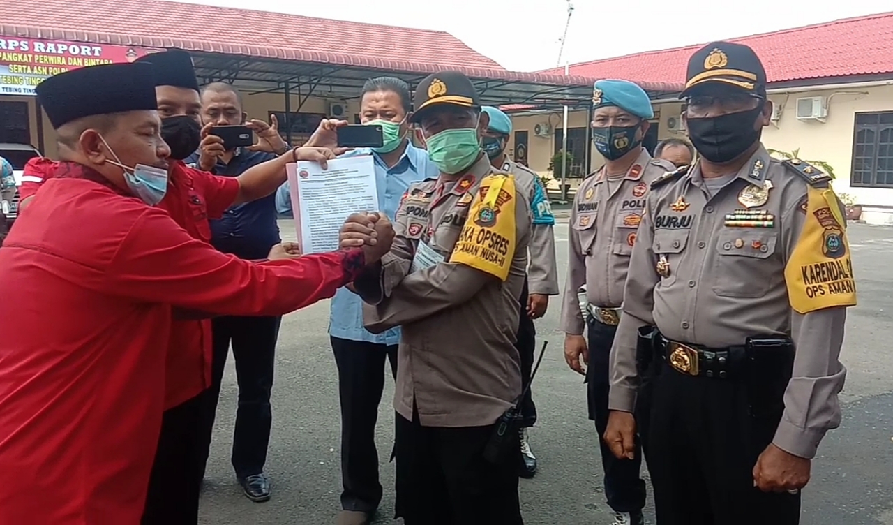 Mereka mendatangi Polres Tebing Tinggi untuk memberikan pernyataan sikap, buntut dari kasus pembakaran bendera partai PDIP dalam aksi unjuk rasa di depan Gedung DPR RI, beberapa waktu lalu.