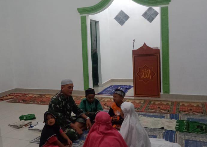 Seperti yang dilakukan salah seorang personel Satgas yang mengajar anak-anak Dusun VII mengaji di Masjid Al Muttaqin, Senin (5/7/2021) malam.