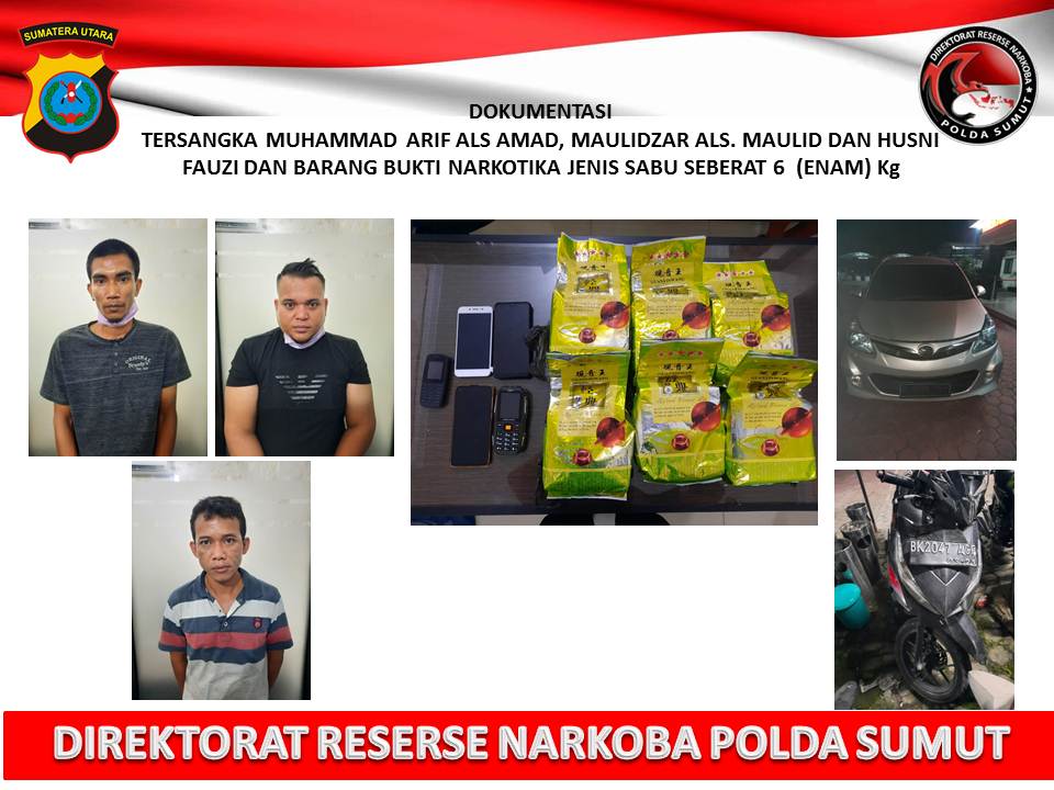 Transpublik.co.id ] Poldasu-Dit Resnarkoba Poldasu berhasil mengungkap kasus tindak pidana Narkotika seberat 6 kg sabu di Jalan Tengku Amir Hamzah, Kel. Jati Makmur, Kec. Binjai Utara, Kota Binjai tepatnya di dipinggir jalan dan Jalan H. Anif Desa Sampali Kecamatan Percut Sei Tuan Kabupaten Deli Serdang tepatnya dihalaman parkir Hotel Miyana, Selasa (23/02/21)