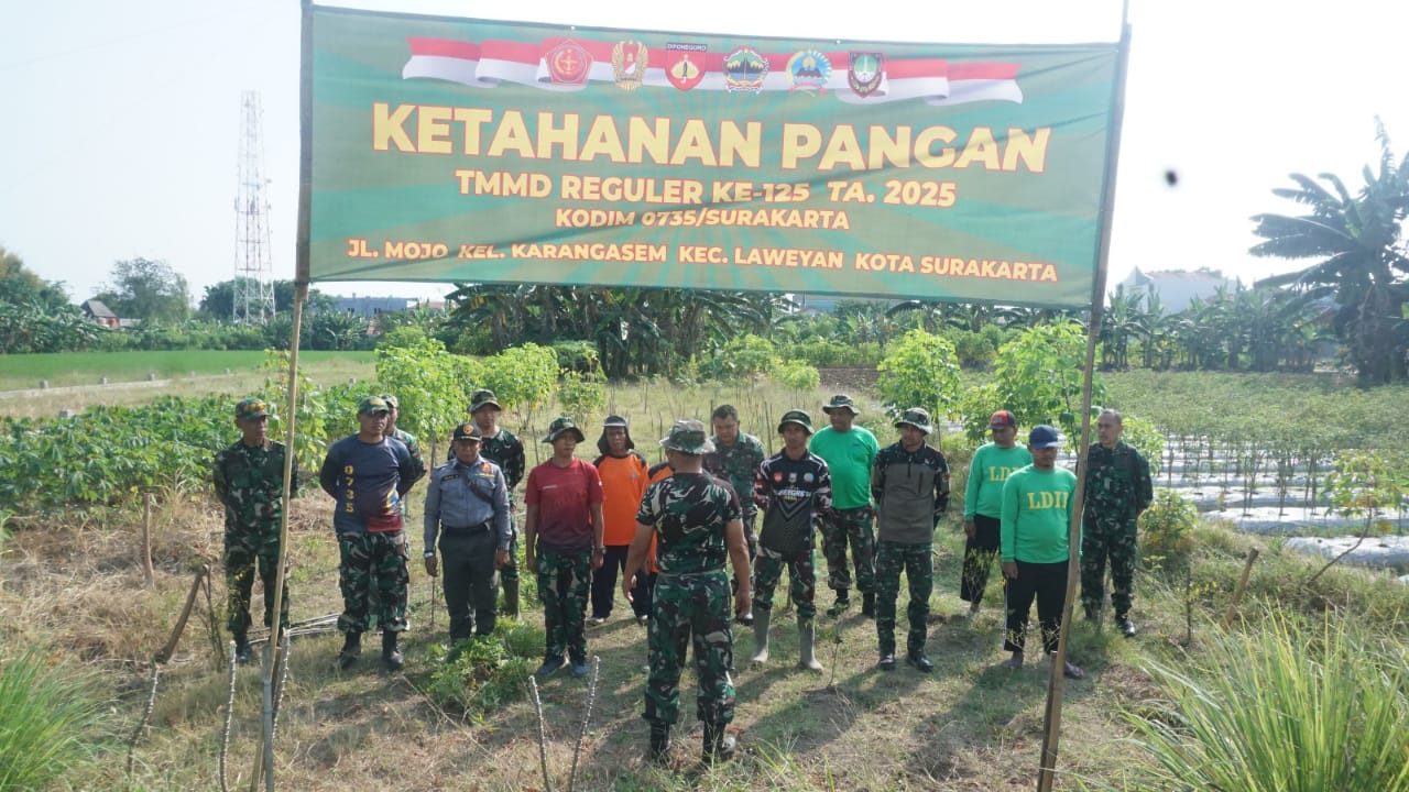 Surakarta – Dalam rangka mendukung dan menyukseskan program dari Kepala Stas Angkatan Darat (Kasad) Jenderal TNI Maruli Simanjuntak, M.Sc tentang ketahanan pangan nasional, Satgas TMMD Reguler ke-125 Kodim 0735/Surakarta melaksanakan kerja bakti penyiapan lahan penanaman jagung di lokasi TMMD Kelurahan Karangasem, Kecamatan Laweyan, Jum’at (25/7/2025).