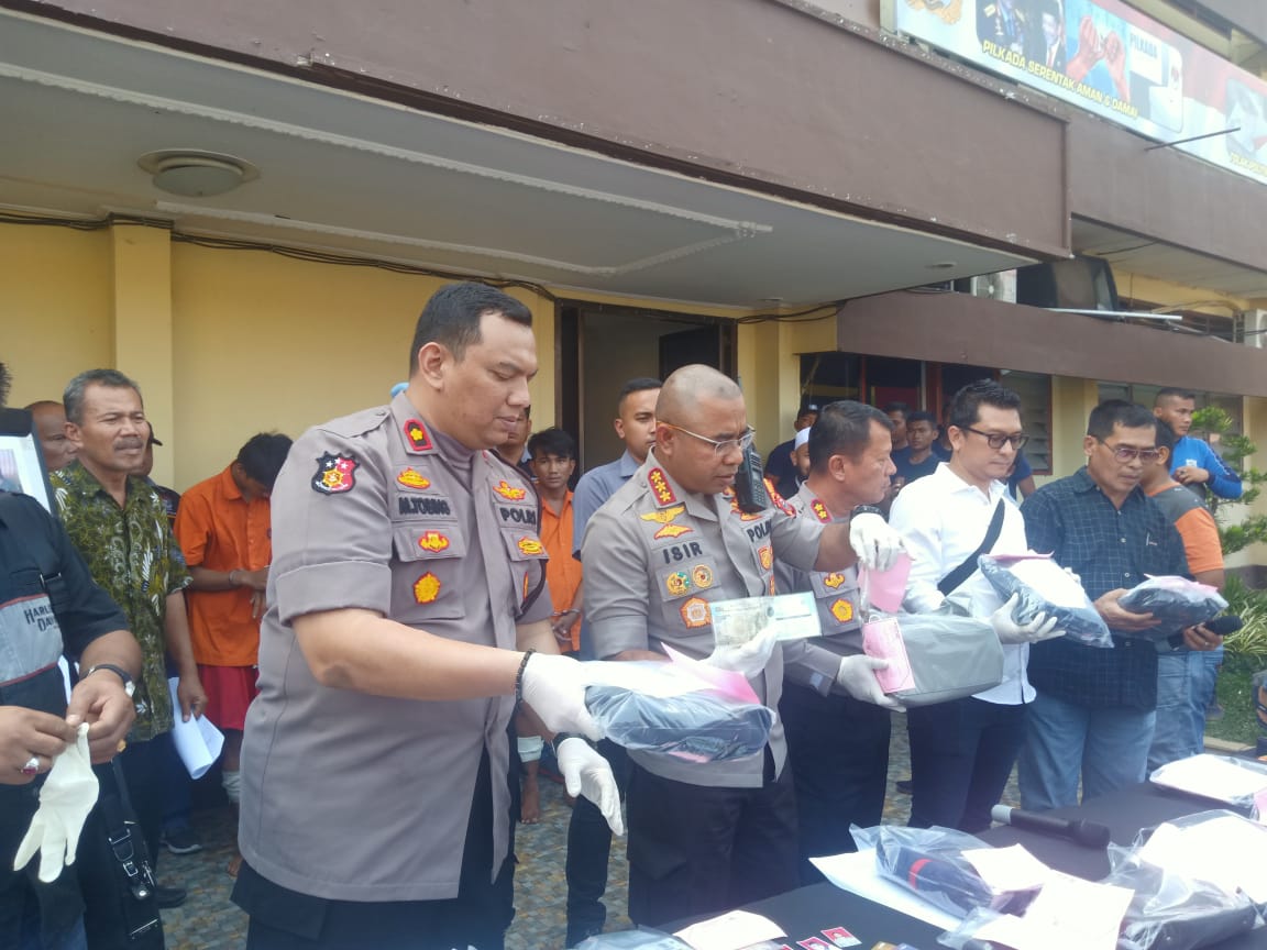 “Pada saat digerebek, personil berhasil menemukan sejumlah barang bukti dari hasil pembegalan yang diduga dilakukan keempat orang itu, selain barang bukti kejahatan personil juga menemukan sabu berikut alat isapnya di kamar pelaku,” ungkap Kombes Pol Johnny Eddison Isir SIK MTCP saat Konfrensi Press.