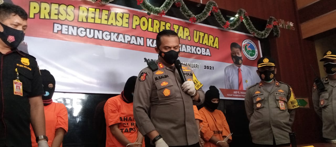 “Tersangka NAM ditangkap petugas yang berjaga di pajak Tarutung dan hasil dari pengembangan dari tersangka NAM di temukan tiga orang tersangka wanita lain berinisial HH(51),I(45) dan S(36) semuanya adalah warga Medan dan ketiga tersangka berhasil ditangkap di Hotel Diaji Tarutung dan dari hasil penggeledahan di temukan Narkotika jenis Sabu seberat 1,68 gram Brutto dan sebagian telah di konsumsi sebelumnya,” terang Kapolres.