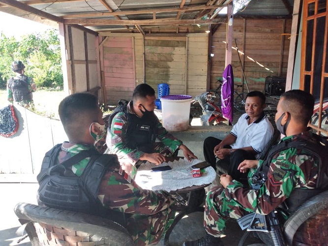 KEEROM | TRANSPUBLIK.co.id – Sarana mempererat tali silaturahmi untuk yang penuh sukacita Natal dan Tahun baru sehingga kita sebagai umat manusia saling menjalin kebersamaan, karena sejatinya kasih itu adalah rasa damai yang memberikan kenyamanan bagi sesama manusia, maka, kali ini Satgas Pamtas Yonif Raider 100/PS Pos Arso 13 dipimpin oleh Serda Boang Manalu selaku Danru Pos Arso 13 melaksanakan anjangsana ke rumah Bapak Eko (47) selaku Kepala Urusan Pembangunan di Kampung Naramben, Distrik Skanto, Kabupaten Keerom, Provinsi Papua, Rabu (30/12/2020).