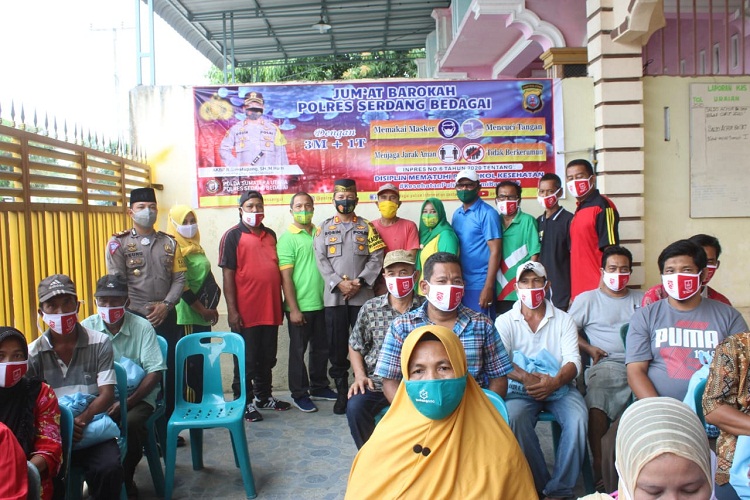 SERGAI | TRANSPUBLIK.co.id – Jumat Barokah, Polres Serdang Bedagai menggelar bakti sosial dengan memberikan bantuan sembako kepada Masyarakat kurang mampu, di Mesjid Silaturahim, Dusun III, Desa Citaman Jernih, Kecamatan Perbaungan, Kabupaten Serdang Bedagai, Jumat (13/11/2020).