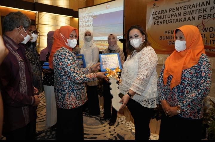 PAKPAK BHARAT | TRANSPUBLIK.co.id – Ketua Gerakan Pemasyarakatan Minat Baca (GPMB) untuk Pakpak Bharat, Juniatry Franc Tumanggor menerima Gerobak Baca dari Ketua GPMB Sumatera Utara (Sumut), Nawal Lubis. Juniatry menerima gerobak baca ini bersama lima Ketua GPMB Kabupaten lainnya di Hotel Arya Duta, Medan, Kamis (23/6/2022).