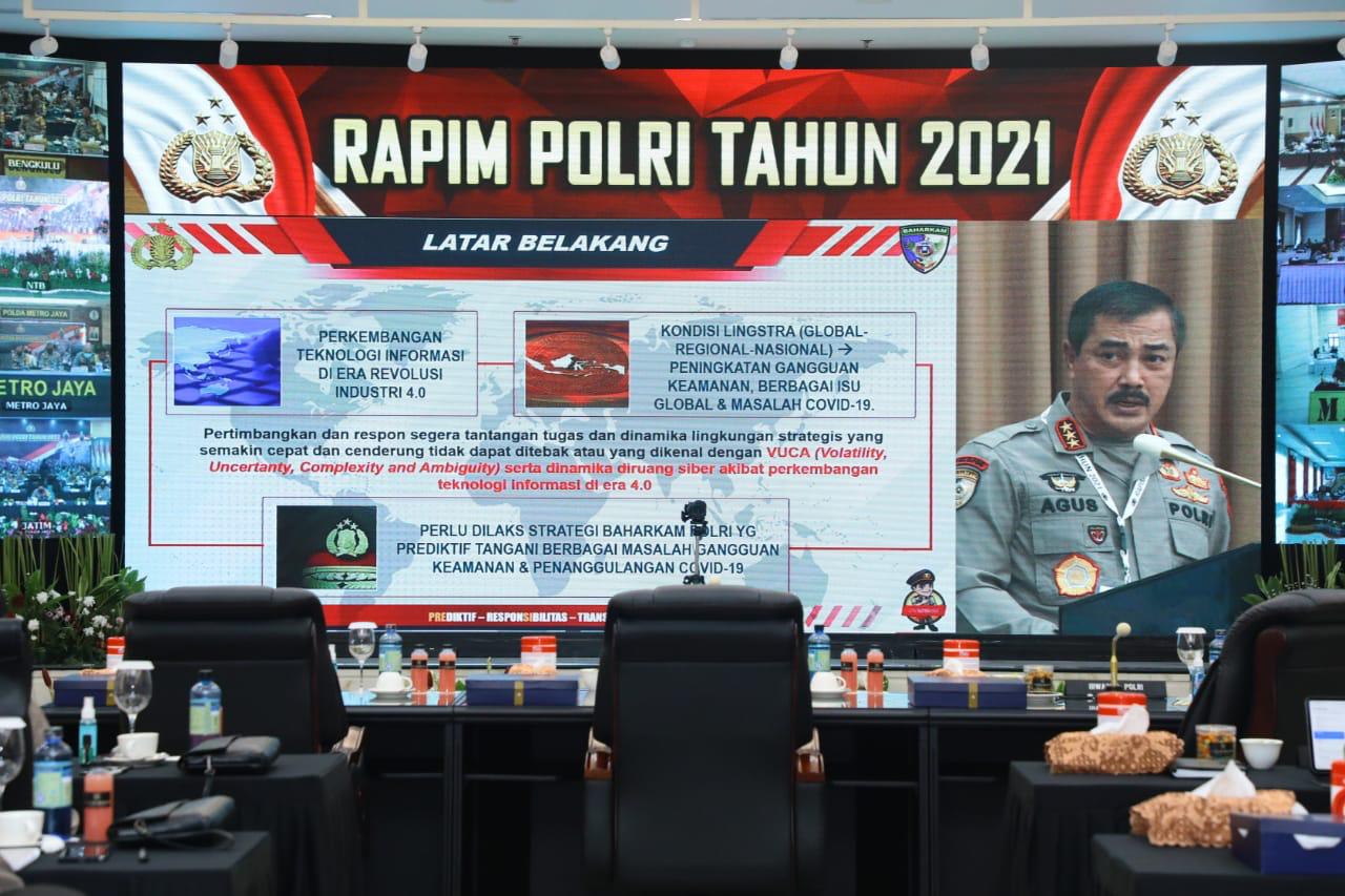 JAKARTA – Kepala Badan Pemelihara Keamanan (Kabaharkam) Polri, Komjen Pol Agus Andrianto, memberikan pengarahan pada Rapat Pimpinan (Rapim) Polri Tahun 2021, di Mabes Polri, Jakarta, Rabu, 17 Februari 2021.