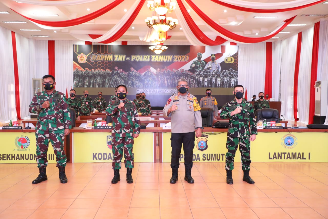 MEDAN | TRANSPUBLIK.co.id – TNI dan Polri di Sumatera Utara mengikuti rapat pimpinan (Rapim) TNI-Polri Tahun 2021 yang digelar secara virtual di Ruang Pertemuan Utama (Rupatama) Mabes Polri, Senin (15/02/21). Rapim TNI-Polri 2021 dipimpin Panglima TNI Marsekal Hadi Tjahjanto dan Kapolri Jenderal Polisi Listyo Sigit Prabowo.