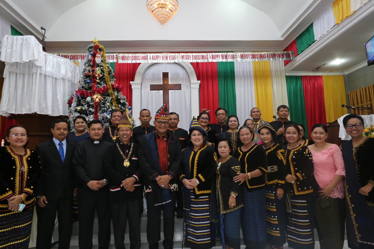 Usai mengucapkan kata sambutannya, Kapolda Sumut dan Ketua Bhayangkari di sambut hangat oleh para pendeta dan jemaat GKPPD dan kemudian juga dipakaikan Baju Khas Adat Pakpak Dairi.