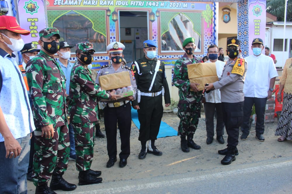 Usai memberikan arahan dan semangat, Kapolda Sumut dan Pangdam I/BB beserta Dansat Brimob juga memberikan bingkisan kepada personil yang melaksanakan penjagaan di Pos penyekatan 1 Torgamba