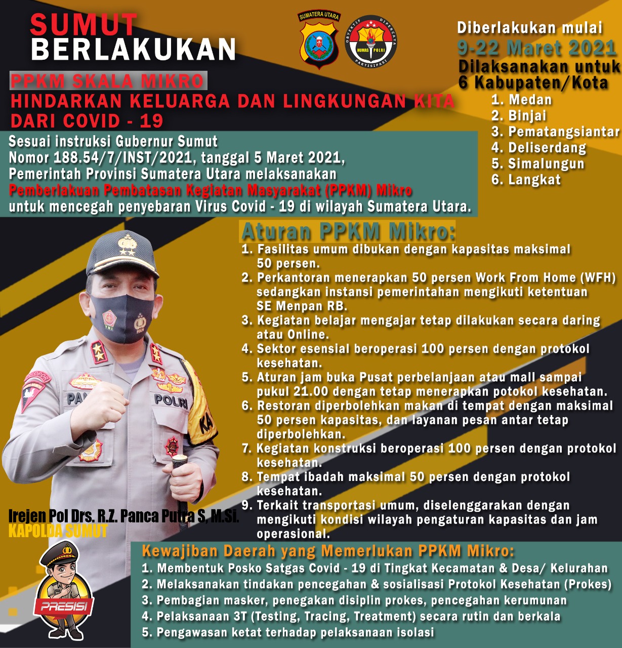 Transpublik.co.id ] PoldaSumut-Kapolda Sumut Irjen Pol RZ Panca Putra Simanjuntak, memperketat Penerapan Pemberlakukan Pembatasan Kegiatan Masyarakat (PPKM) skala Mikro di 6 Wilayah dan Kabupaten yang ada di Sumatera Utara.