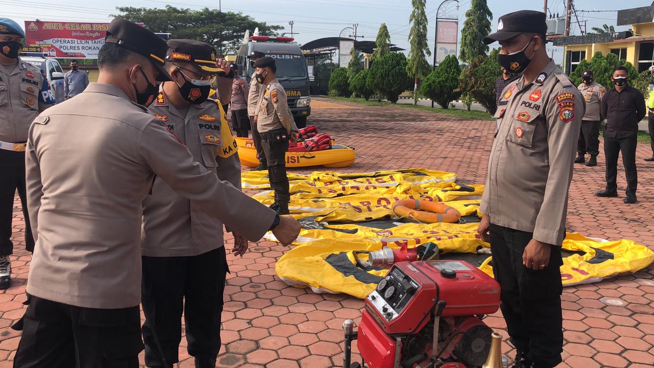 Usai memberikan sambutan, Kapolres Rokan Hilir diikuti rombongan melakukan pengencekan sarana prasarana dalam rangka kesiapasiagaan seperti Pengecekan Ranmor, Alat Pemadam dan Perahu Karet terdiri dari 6 unit Roda 2, 10 unit Roda 4,11 unit mesin pemadam api dan 6 unit perahu karet .