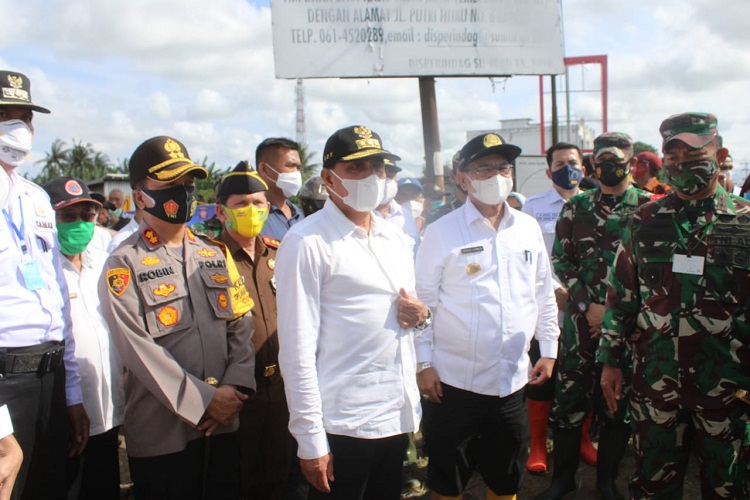 Kapolres Sergai AKBP Robin Simatupang bersama Dandim 0204/DS Letkol Kav. Jackie Yudhantara, Kejari Sergai Paian Tumanggor, Ketua DPRD Kab. Sergai dr. M. Risky Hasibuan mendampingi Gubsu dan Pangdam meninjau lokasi banjir.