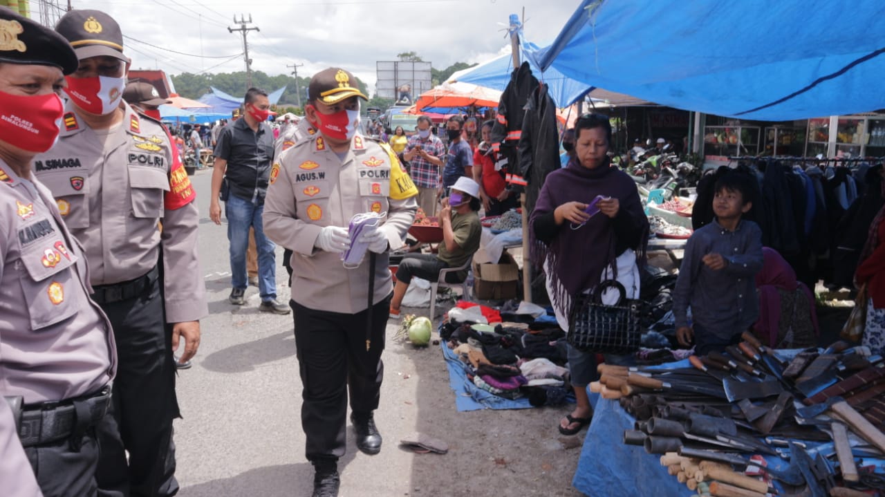 SIMALUNGUN | TRANSPUBLIK.co.id – Pada hari Jumat (19/6/2020), Pasar Tradisional Kec. Tiga Runggu Jl. Purba Dolok, Kab. Simalungun, Kapolres Simalungun AKBP Agus Waluyo, S.I.K., melakukan pengecekan penerapan Protokol Kesehatan para pedagang serta pembeli, dengan didampingi oleh Kabag Ops Kompol S. L. Widodo, Kasat Sabhara Akp. N Manurung, Kasat Binmas Akp. Yani Sinulingga, Kasi Propam Iptu Alwan serta Kapolsek Purba Iptu M. Sinaga yang diikuti Camat dan Danramil Kec. Tiga Runggu.