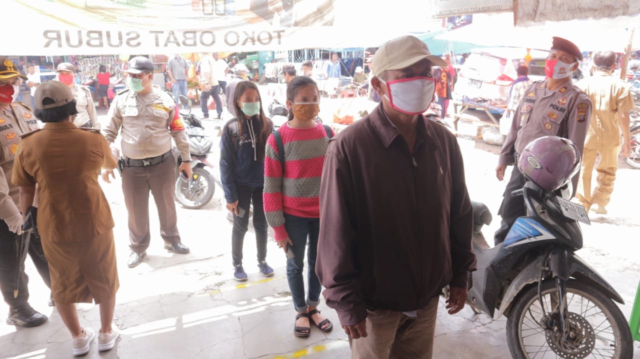 AKBP Agus Waluyo S.I.K., pada kesempatan ini juga membagikan masker kepada masyarakat yang hendak belanja dan para pedagang yang tidak menggunakan masker, Kapolres menyampaikan kepada masyarakat bahwa pemerintah saat ini sedang menerapkan, kebiasaan baru atau New Normal, dalam kegiatan sehari hari.