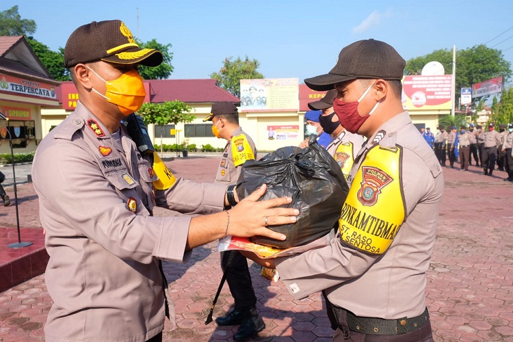Pelaksanaan kegiatan penyerahan sembako oleh Kapolres Tanjungbalai Putu Yudha, kepada para Bhabinkamtibmas berakhir pada sekira pukul 09.15 WIB. (Rahmat Hidayat)