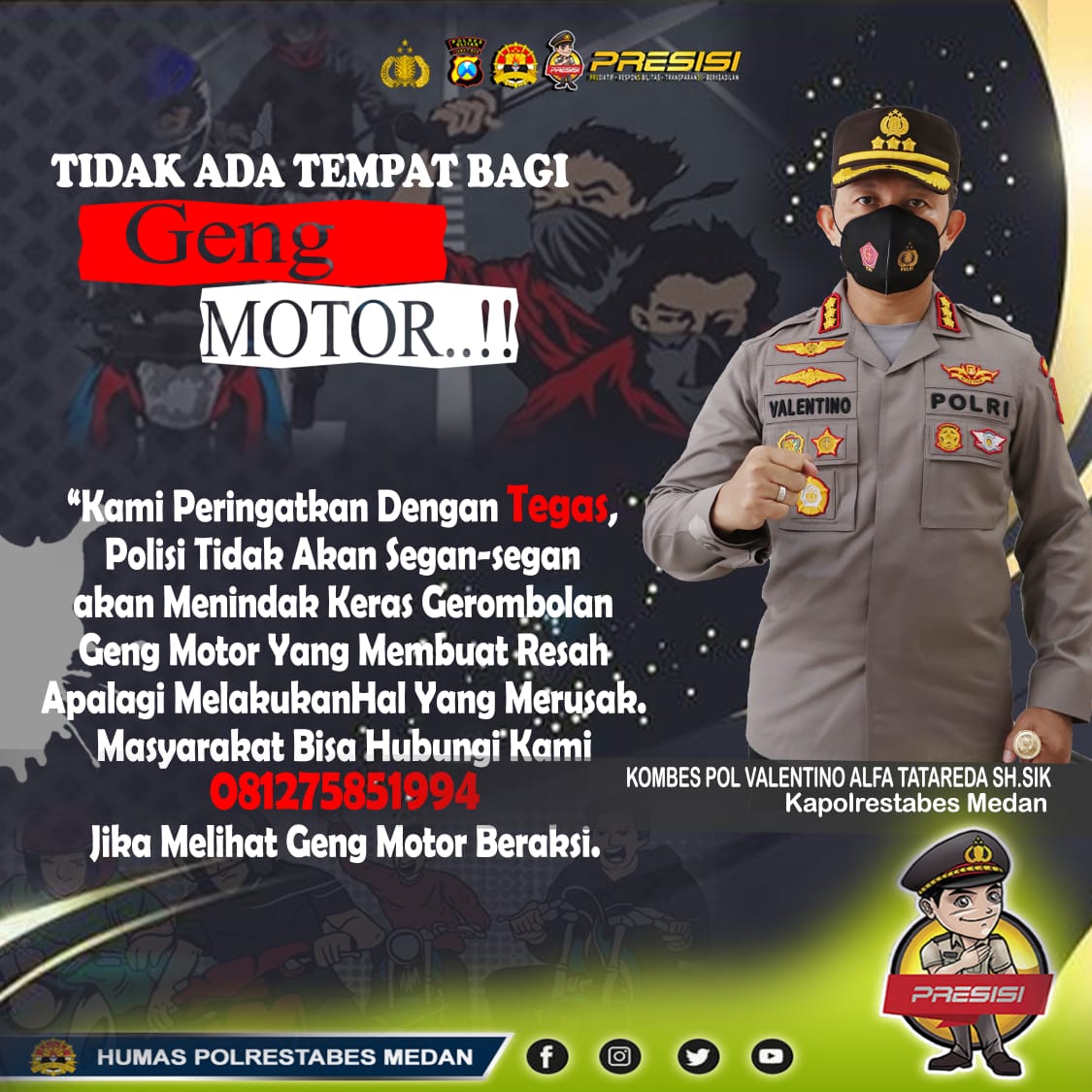MEDAN | TRANSPUBLIK.co.id – Kapolrestabes Medan, Kombes Pol Valentino Alfa Tatareda SIK MSi, menegaskan tidak ada tempat bagi genk motor.