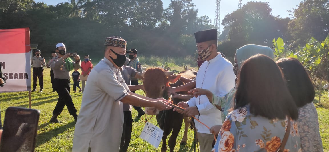 Kasetukpa Lemdiklat Polri Brigjen Pol Mardiaz Kusin Dwihananto SIK MHum setelah pelaksanaan sholat Idhul Adha di Lapangan Tembak Setukpa Lemdiklat Polri dilanjutkan penyerahan hewan qurban kepada panitia tersebut.