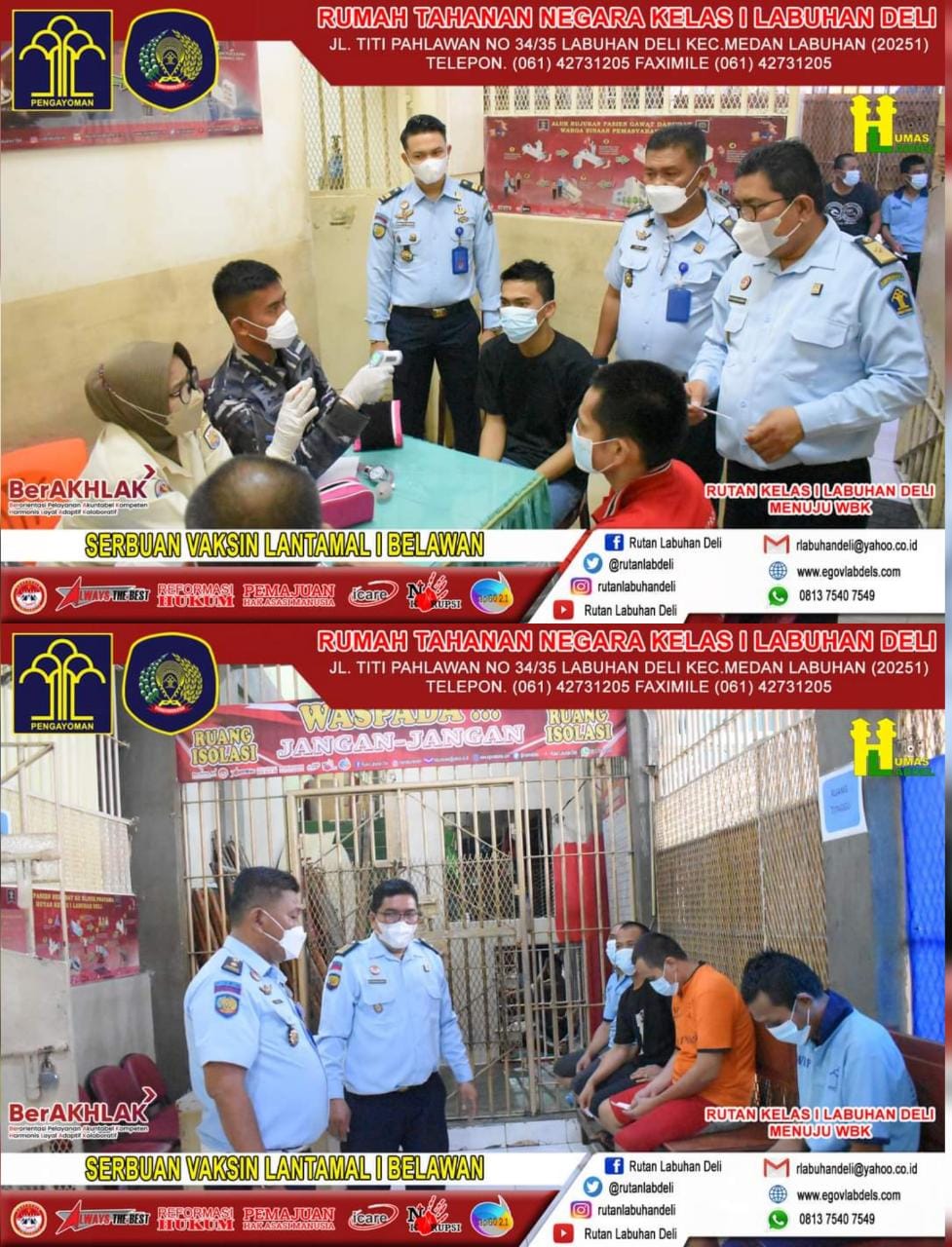 Bertempat di ruangan klinik pratama Rutan Kelas I Labuhan Deli, dilaksanakan vaksin I Gelombang ke-12 , Vaksin II Gelombang ke-5 dan vaksin III Gelombang ke-4 di Rutan I Labuhan Deli. Vaksinasi hari ini menggunakan vaksin Astrazeneca di ikuti sebanyak 71 orang. Wbp yang mendapat vaksin I Gelombang ke-12 sebanyak 16 orang, wbp yang mendapat vaksin II Gelombang ke-5 sebanyak 40 orang dan Vaksin III gelombang ke-4 sebanyak 11 Orang dan pegawai beserta keluarga sebanyak 4 Orang.
