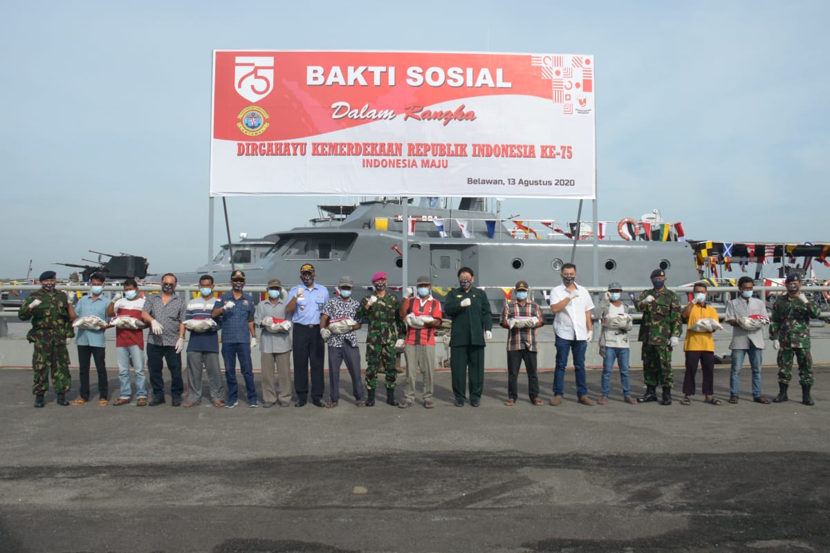 Dalam bakti sosial yang digelar Lantamal I, menyalurkan tali asih berupa pembagian sembako dukungan dari instansi pemerintah maupun swasta kepada para nelayan sebagai bentuk kepedulian, kebersamaan dan jalinan tali silahturahmi Lantamal I dengan masyarakat dan nelayan di sekitar Belawan. (Dispen Lantamal I)