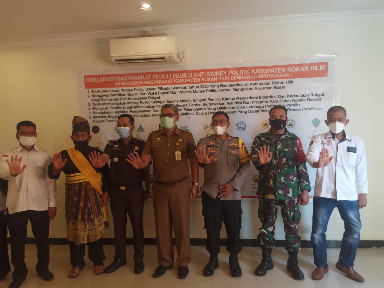 Giat Deklarasi diikuti Asisten I Pemerintahan Ferry H. Parya, Kapolres Rohil AKBP Nurhadi Ismanto, SH. SIK, Dandim 0321/Rohil diwakili Kapten Inf Tayung, Kejari Rohil diwakili Kasipidum Yongki Arfias, SH MH, Ketua KPU Rohil diwakili Komisioner Divisi SDM-Partisipasi Pemilih Tuah Pangabean Nasution.MA, Ketua Bawaslu Rohil Syahyuri, M.Si, Ketua LAM Rohil Datuk H. Rasyid Abizar.