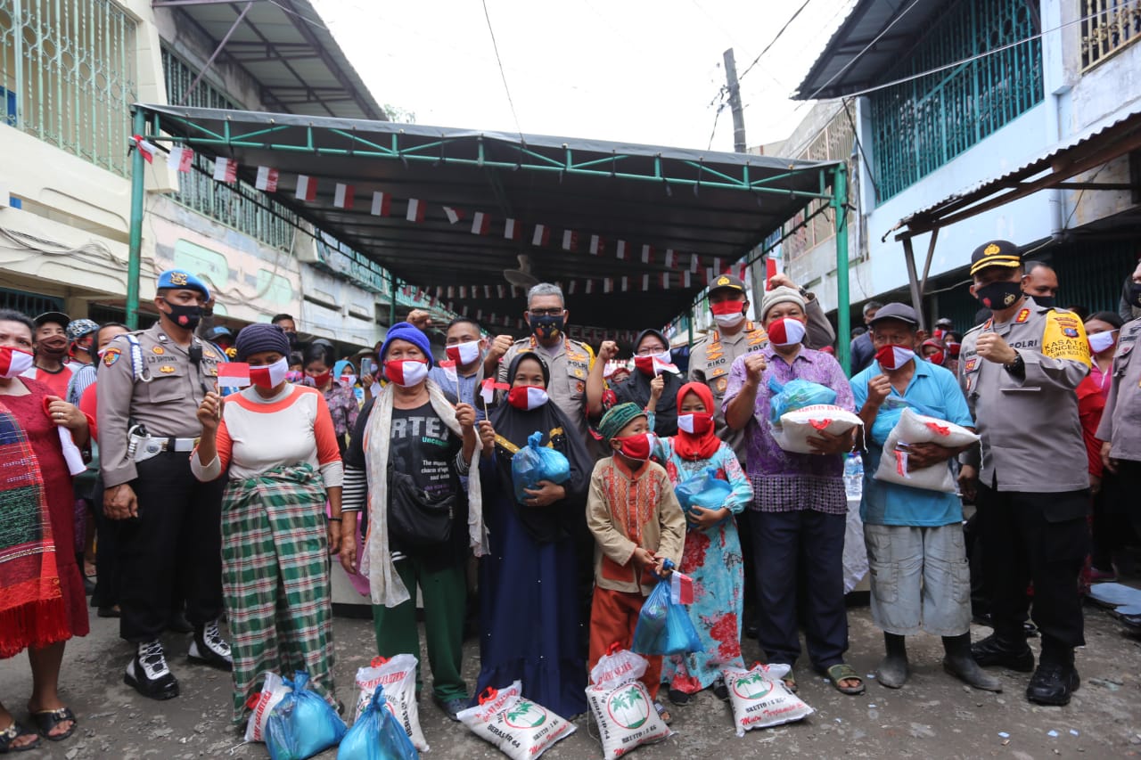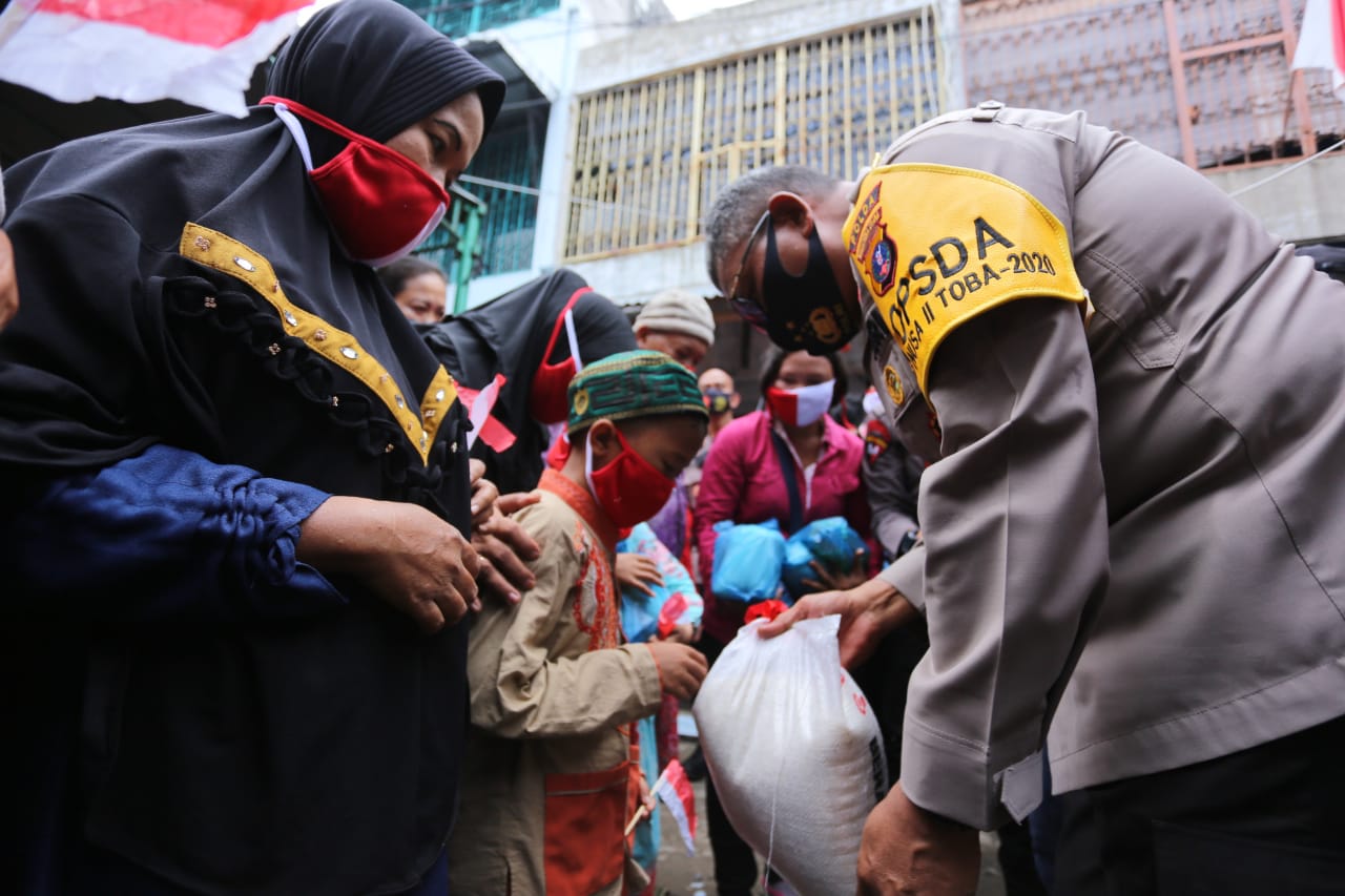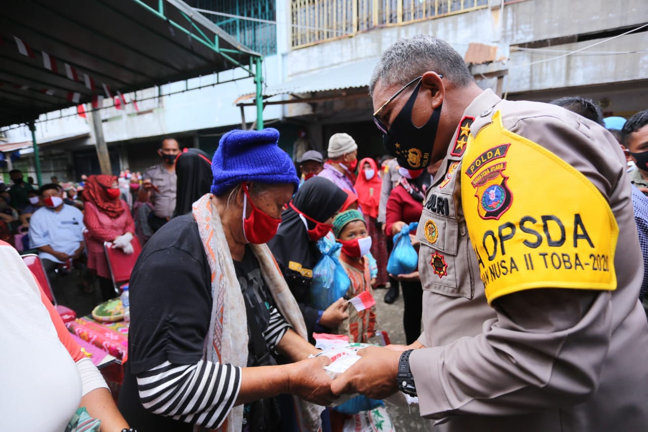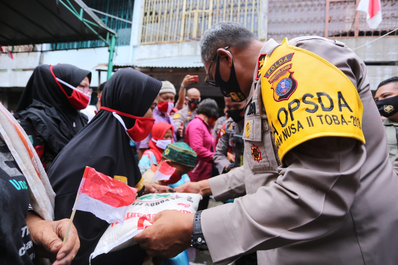 Usai mensosialisasikan protokol kesehatan, Kapoldasu kemudian memberikan bantuan sembako kepada warga sekitar maupun para pedagang. “Di saat pandemi covid ini kita saling membantu kepada sesama,” ucapnya.