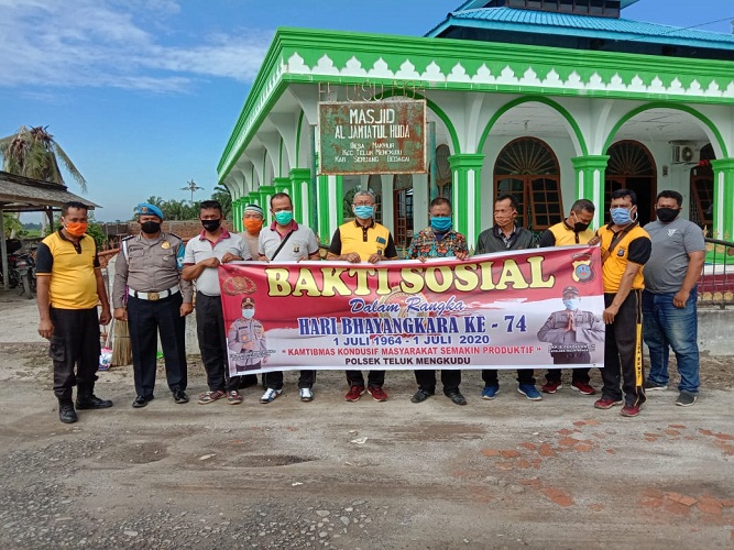 SERGAI | TRANSPUBLIK.co.id – Menyambut Hari Bhayangkara ke 74 tahun 2020, Polsek Teluk Mengkudu Polres Serdang Bedagai menggelar bhakti sosial bertempat di Mesjid Al Jamiatul Huda, Dusun II, Desa Makmur, Kec. Teluk Mengkudu, Kab. Serdang Bedagai, Kamis (25/6/2020).