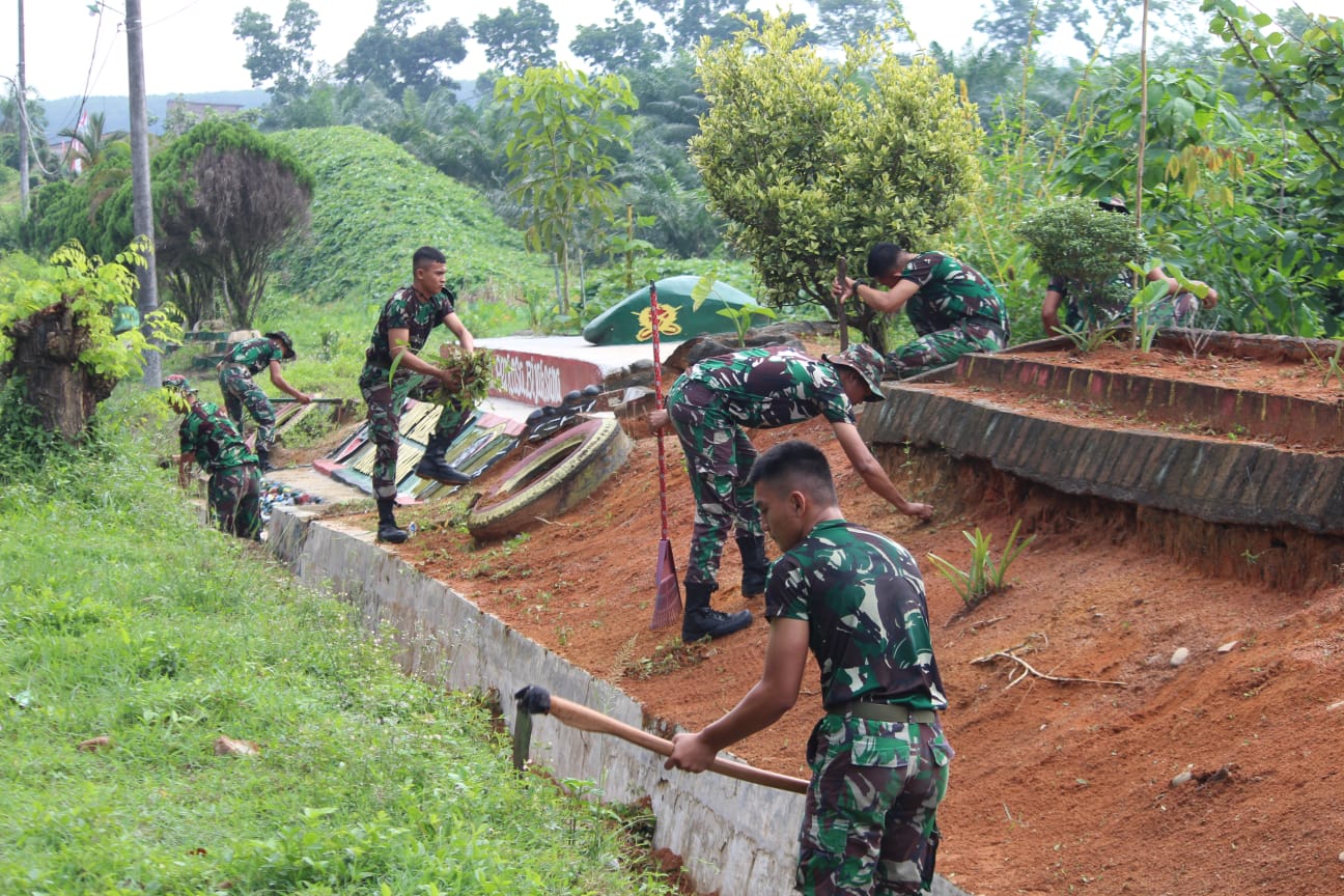 Turut dalam kegiatan gotong royong, Camat Galang M. Faisal Nasution, Letda Inf Kokoh Dwi Handoko, para prajurit Yonif Mek 121/MK dan para warga masyarakat Galang.