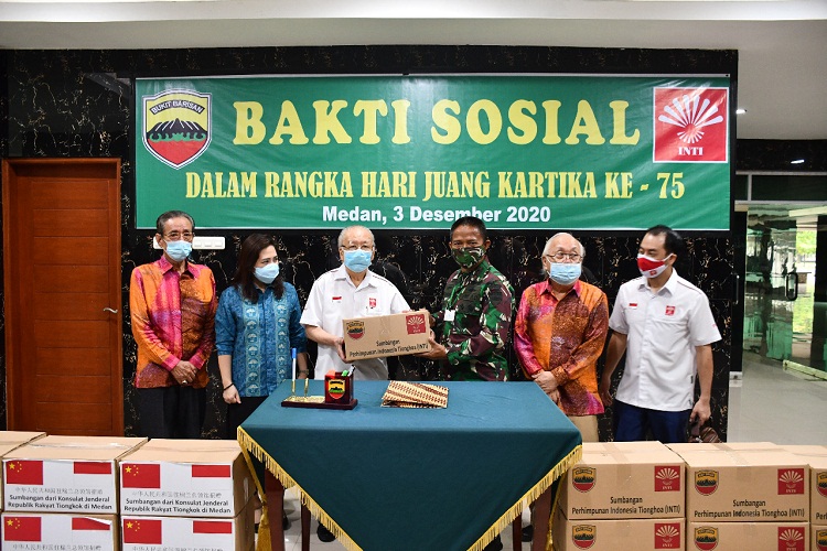 Bantuan berupa 1000 paket sembako ini diserahkan secara simbolis oleh Ketua INTI Sumut, Dr Indra Wahidin bersama Konjen RRT di Medan, Mr Qiu Wei Wei kepada Pangdam I/Bukit Barisan, Mayjen TNI Hassanudin, SIP, MM, di Serambi Kehormatan Makodam I/BB, Kamis (3/12/2020).