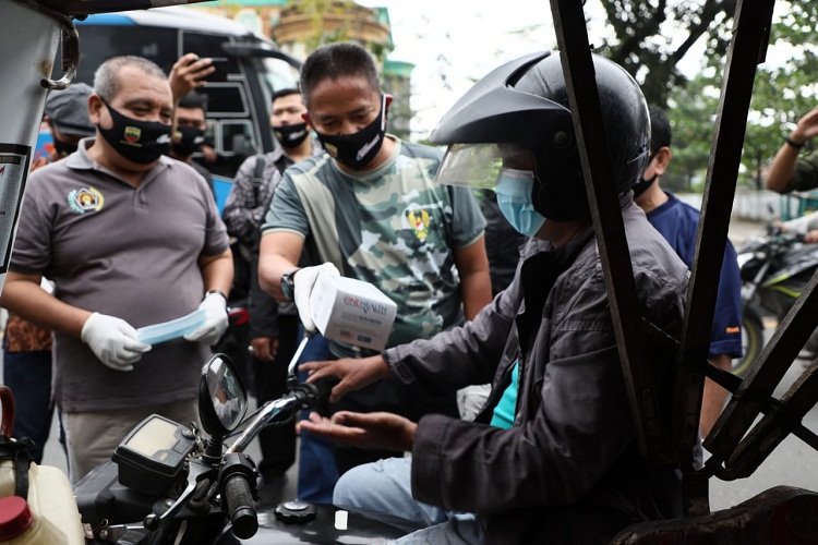 Dalam kegiatan Operasi Protkes, Pangdam I dan PJU Kodam I/ BB terlihat membagikan masker kepada para pengemudi kenderaan yang melintasi di depan Makodam I/BB. (Sumber: Pendam I/BB)
