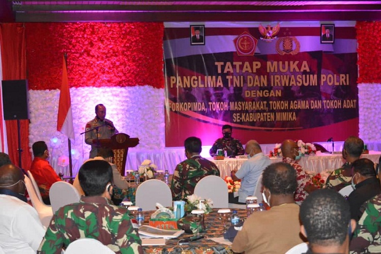 PAPUA | TRANSPUBLIK.co.id – Panglima TNI Marsekal TNI Hadi Tjahjanto, S.I.P., didampingi Irwasum Polri Komjen. Pol. Drs. Agung Budi Maryoto, M.Si., melaksanakan kunjungan kerja Papua, bersilaturahmi dan bertatap muka langsung dengan Forkopimda, Tokoh Masyarakat, Tokoh Agama dan Tokoh Adat Papua, dengan menerapkan Protokol kesehatan yang cukup ketat. Bertempat di Rimba Papua Hotel Timika, Papua Indonesia, Sabtu (28/11/2020).