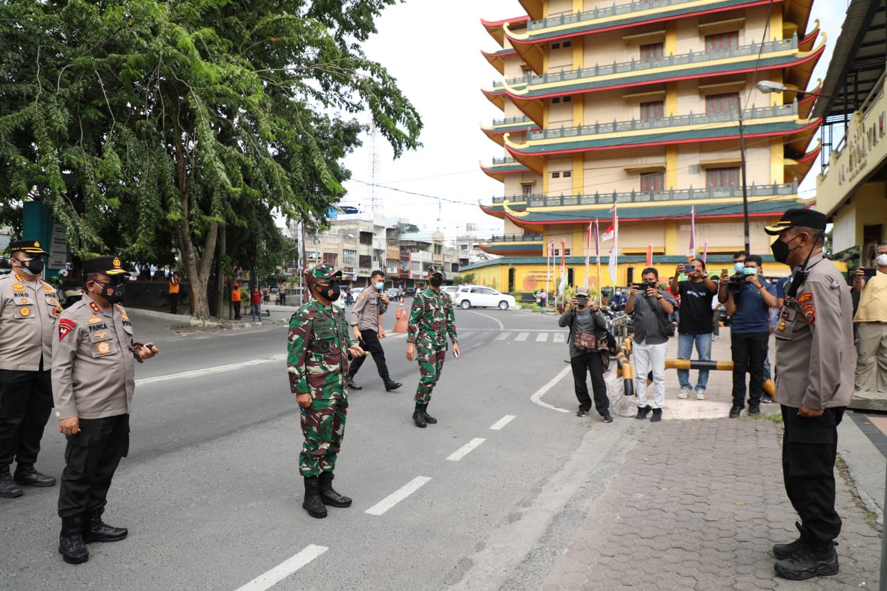 Usai mengecek pos penyekatan di perbatasan Kota Medan dengan Deliserdang, rombongan Kapoldasu dan Pangdam I/BB melanjutkan perjalanan ke pos penyekatan dalam Kota Medan di Jalan Sisingamangaraja/Indogrosir.