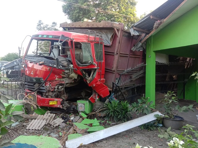 TEBING TINGGI | TRANSPUBLIK.co.id – Akibat patah stang stir mobil truck tronton yang bermuatan pupuk seruduk tembok pagar rumah warga, Kamis (9/7/2020) Jalan lintas tepatnya di Jalan Soekarno Hatta, Kelurahan Tambangan, Kec. Padang Hilir, Kota Tebing Tinggi.