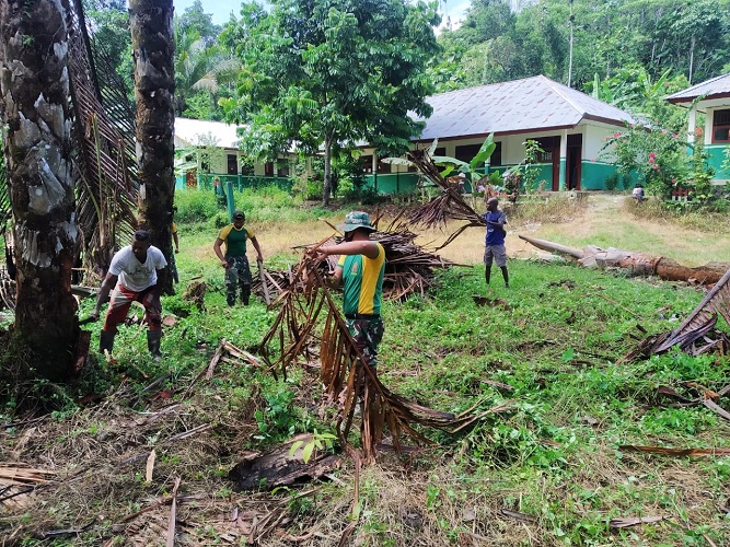 KEEROM | TRANSPUBLIK.co.id – Satgas Pamtas RI-PNG Yonif Mekanis Raider 413 Kostrad Pos Skamto bersama perangkat Sekolah membersihkan Lingkungan SD Inpres Yowong yang terletak di Kampung Yowong Distrik Arso Barat Kabupaten Keerom.