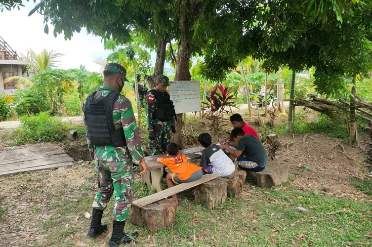 KEEROM | TRANSPUBLIK.co.id – Personel Pos Arso 13 Satgas Pamtas Republik Indonesia (RI)-Papua Nugini (PNG) Yonif Raider 100/PS memberikan Bimbingan Belajar (Bimbel) kepada anak-anak Sekolah SD Negeri Arso 13 di Kampung Naramben, Distrik Skanto, Kabupaten Keerom, Papua Minggu (15/11/2020).