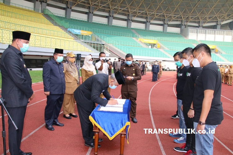 Pemkot Bekasi dan Gojek Menjalin Kemitraan Layanan Publik Berbasis Digital di Stadion Patriot Chandrabaga Bekasi.
