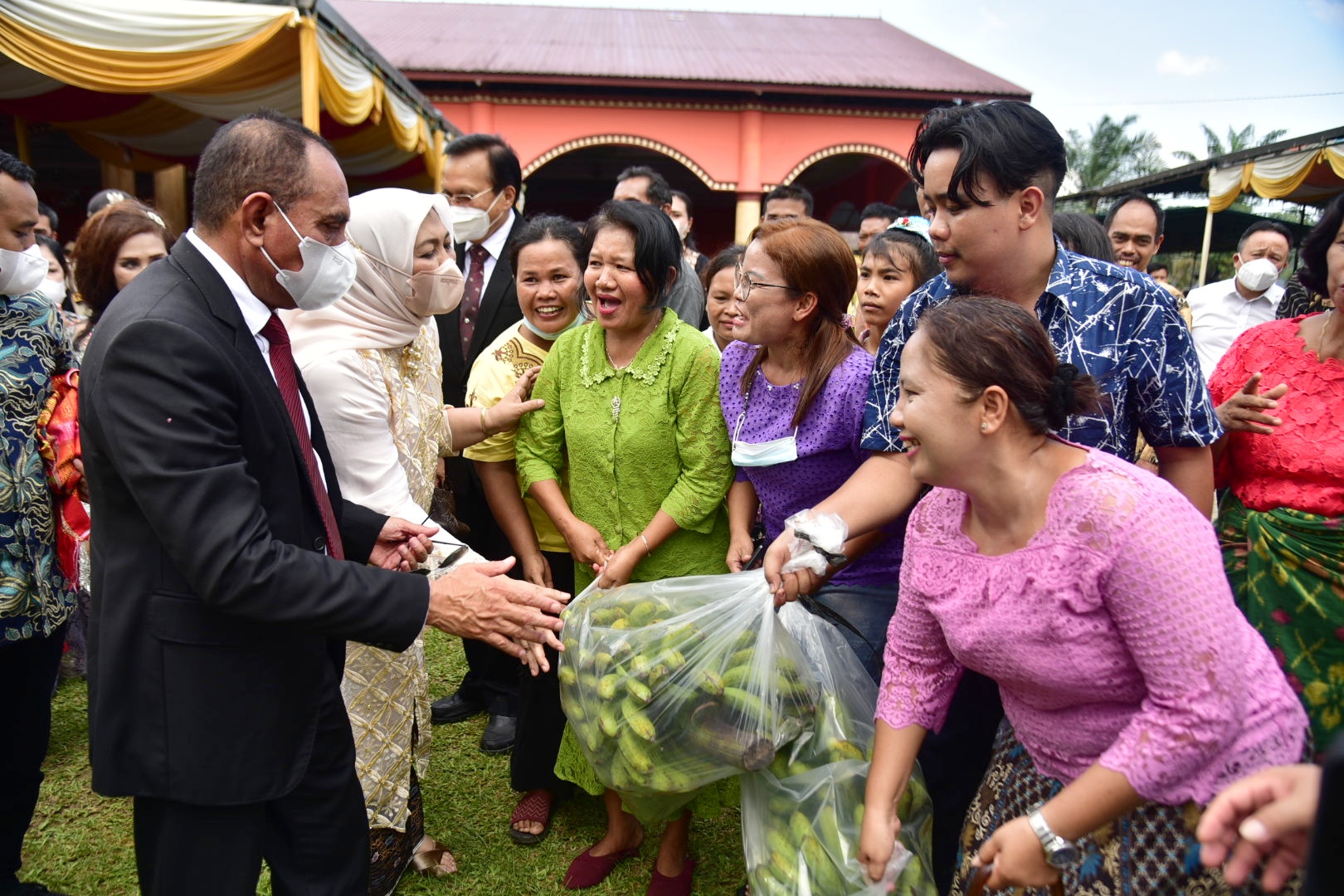 Sementara itu, sebagai rasa apresiasi dan bangga atas kehadiran gubernur, para warga dari Gereja Stasi Bangun Jati Rayon Negara dan Gereja Stasi Namo Pinang, Kecamatan Sibiru-biru, menyerahkan hasil bumi berupa ikan mas dan buah pisang kepada gubernur.